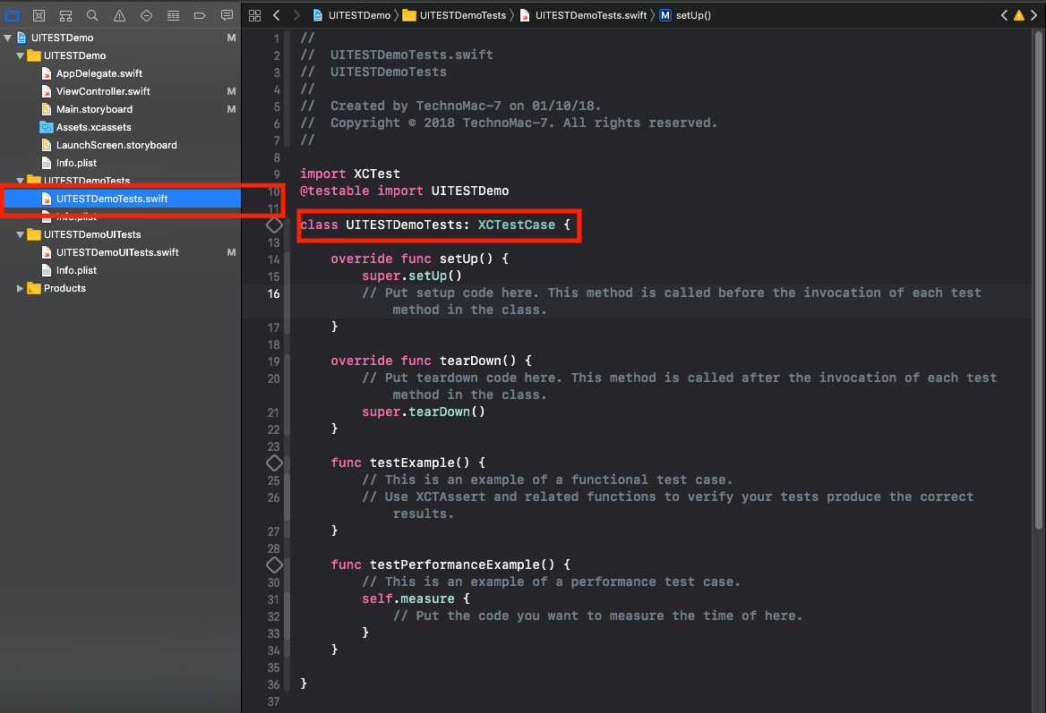 The template imports XCTest and defines a UITESTDemoTests subclass of XCTestCase, with setup(), tearDown() and example test methods. Also, it Inherit the XCTestCase class.